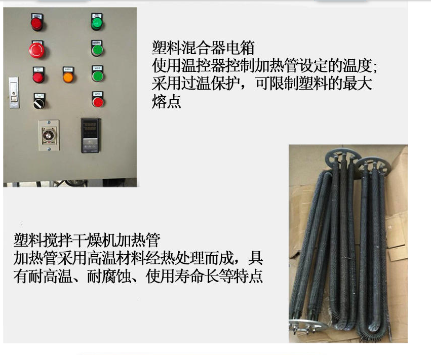 8、干燥混合功能二合一,當不需要干燥時,只需將"加熱開關"及"風機開關"關閉,本系列機型即可用于塑料攪拌均化用途,一機二用.